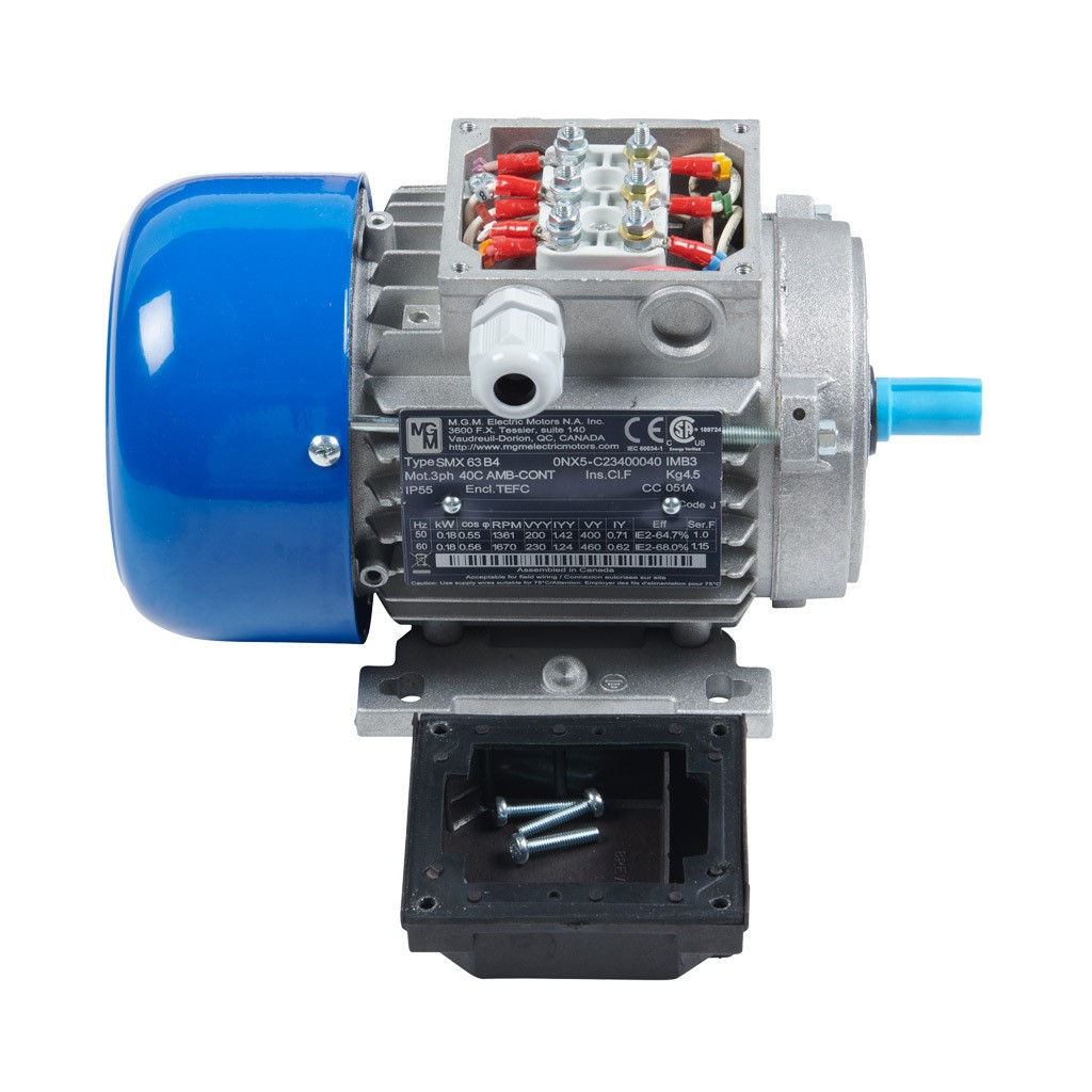 M.G.M. Electric Motors SMX IE2 high efficiency AC induction motor, general purpose and inverter rated, 1/4hp, 3-phase, 230/460 VAC, 1800rpm, TEFC, IEC 63 frame, aluminum, rigid base (B3) mount.